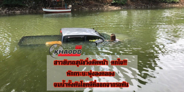 สาวขับรถสุนัขวิ่งตัดหน้า ตกใจ! หักกระบะพุ่งลงคลอง จมน้ำทั้งคันโชคดีที่ออกจากรถทัน