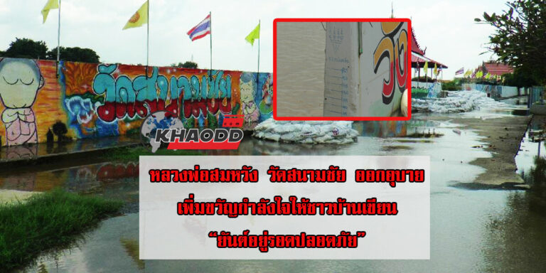 หลวงพ่อสมหวัง วัดสนามชัย อ่างทอง หอบชายผ้าเหลือง ลุยน้ำเพื่อมาเขียนระดับน้ำที่พนังกั้นน้ำ แต่ก็เป็นที่ฮือฮาเกิดขึ้น เนื่องจากมีการเขียน “ยันต์อยู่รอดปลอดภัย”