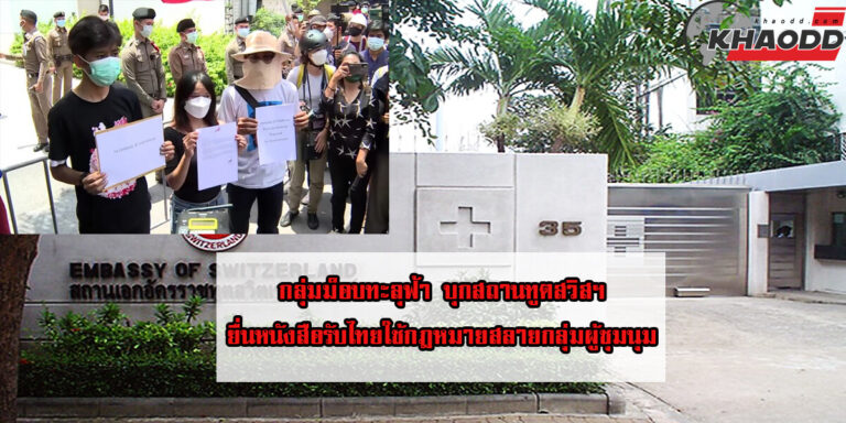 กลุ่มม็อบทะลุฟ้า บุกด่วนถึงสถานทูตสวิสฯประจำประเทศไทย ยื่นหนังสือร้องต่อกฎหมายว่าด้วยเรื่องรัฐบาลไทยสลายการชุมนุม