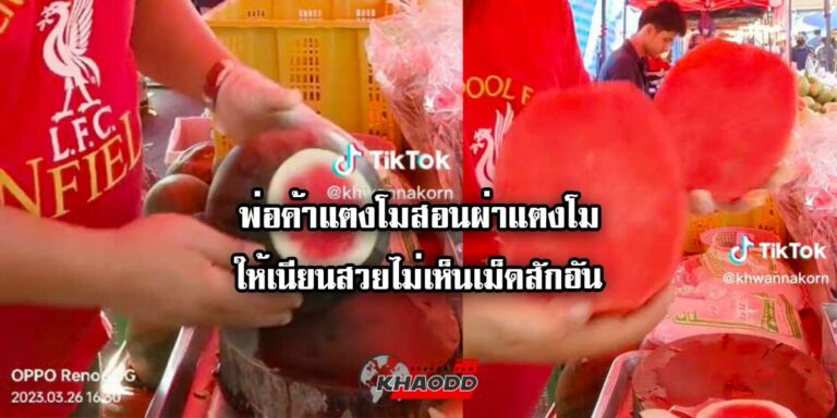 พ่อค้าแตงโมสอนผ่า “แตงโม” ไร้เมล็ดให้ดูเหมือนกินง่ายน่าซื้อไปทาน