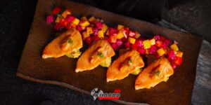 • หั่นเนื้อปลาแซลมอนเป็นชิ้นเต๋าขนาด 5 ซม. ใส่ถ้วย
