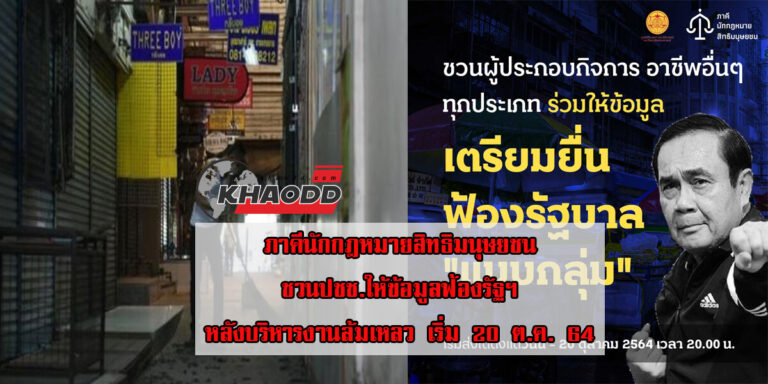 ภาคีนักกฎหมายสิทธิมนุษยชน ร่วมจับมือ ศูนย์นิติศาสตร์ คณะนิติศาสตร์ มหาวิทยาลัยธรรมศาสตร์ ออกเชิญชวน ผู้ประกอบกิจการ และประชาชนทุกกลุ่มอาชีพ ช่วยกันให้ข้อมูลเพื่อยื่นฟ้องรัฐบาล
